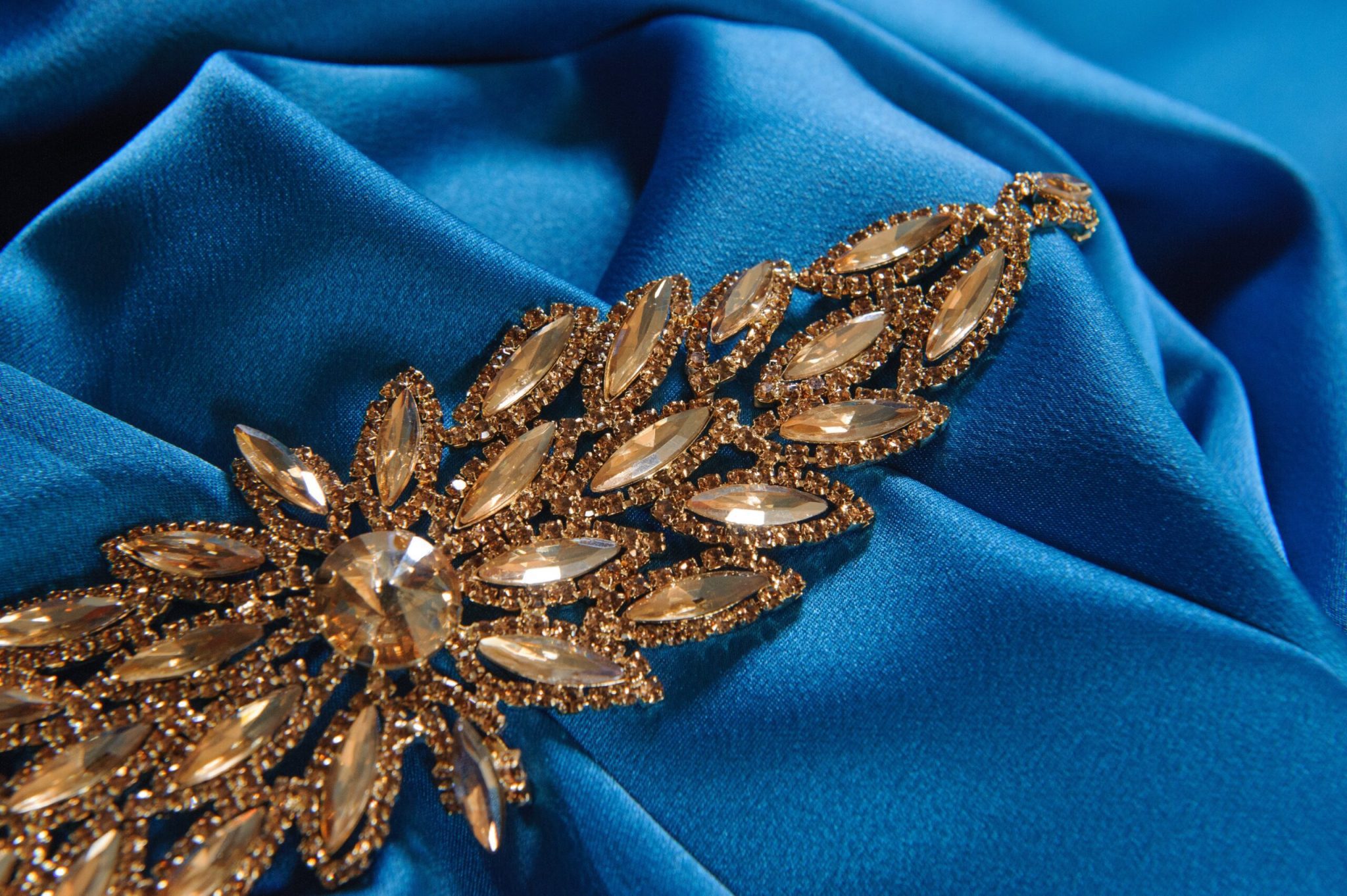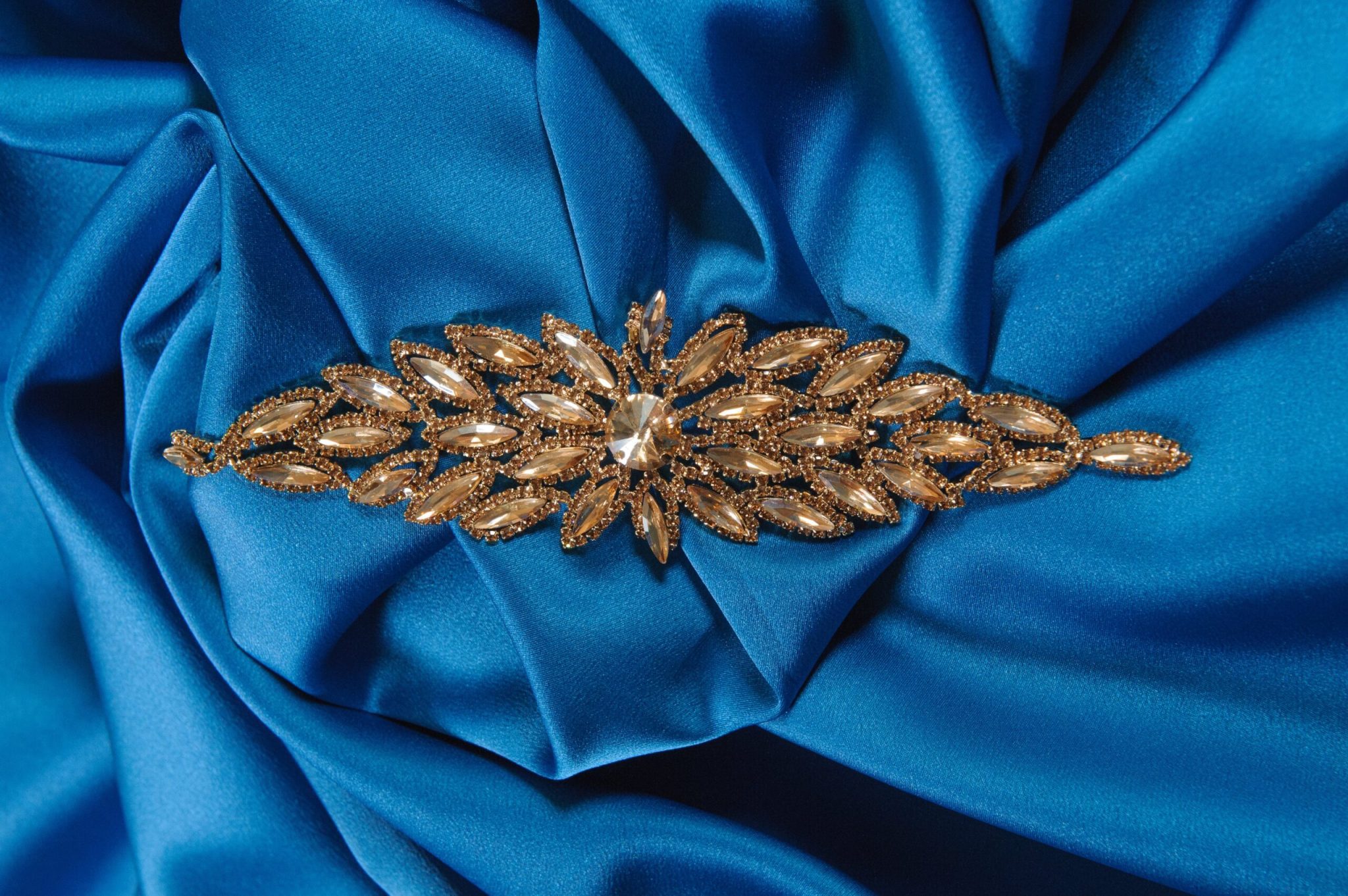 Aplicatia cu cristale și strasuri aurii de diferite dimenșiuni se poate aplica pe diferite articole vestimentare cum ar fi:camași, bluze elegante, rochii de seară etc. Aceasta aplicatie se coase manual.