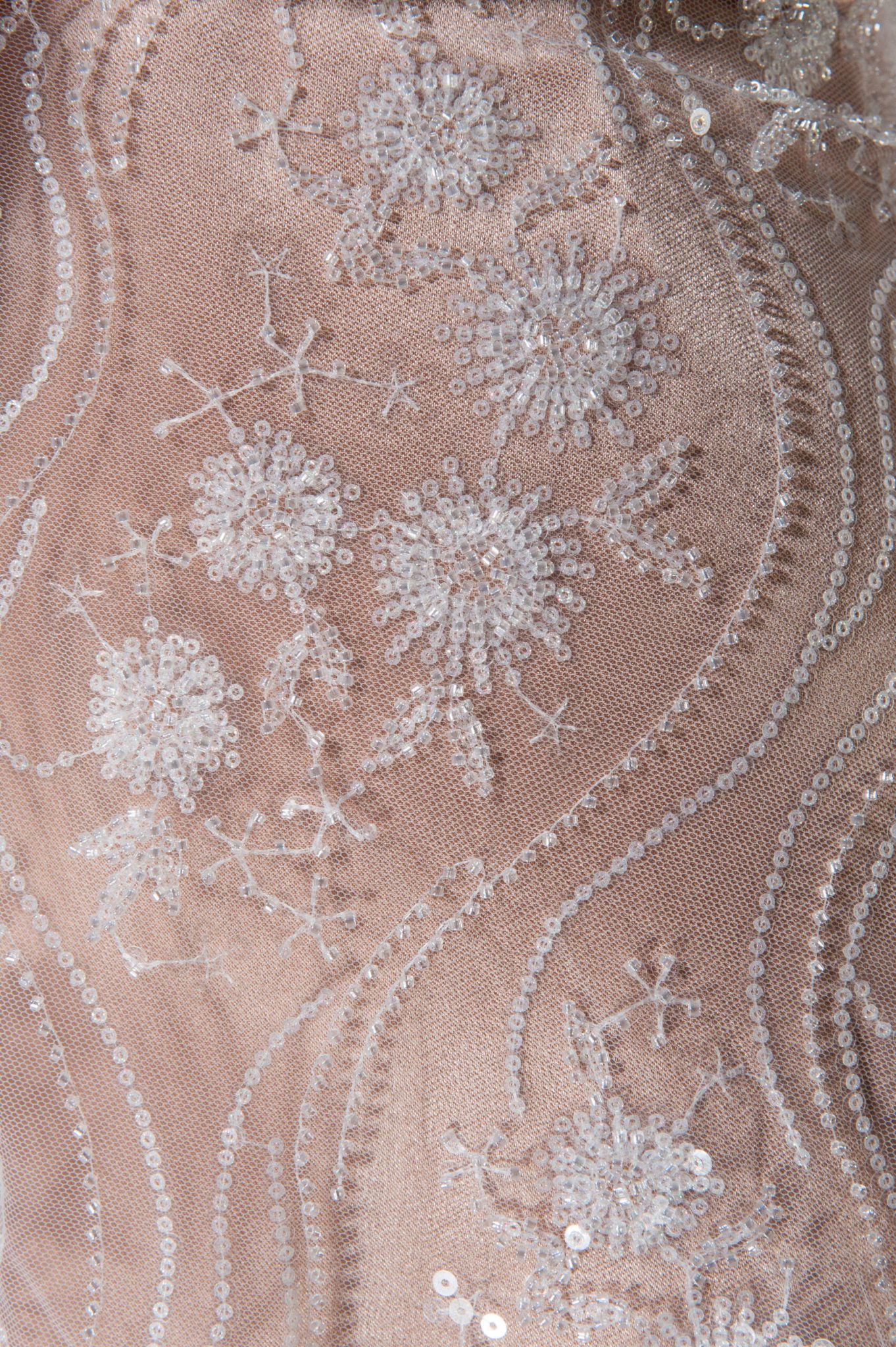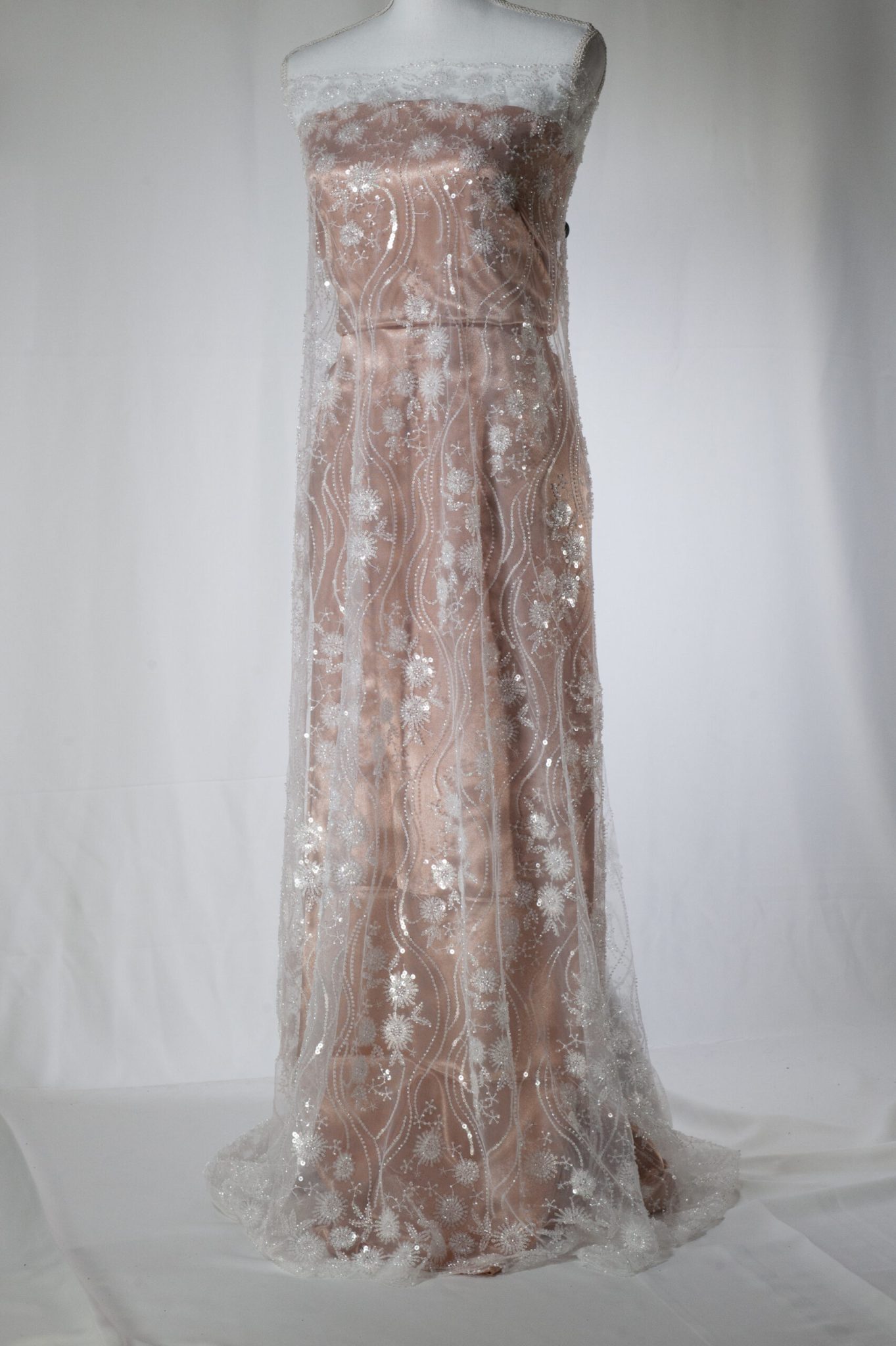 Broderia pe tulle alba este accesorizată cu paiete și mărgele în același ton sub forma de flori mici în romb, ceea ce îi oferă dantelei un aspect spectaculos și luminos.