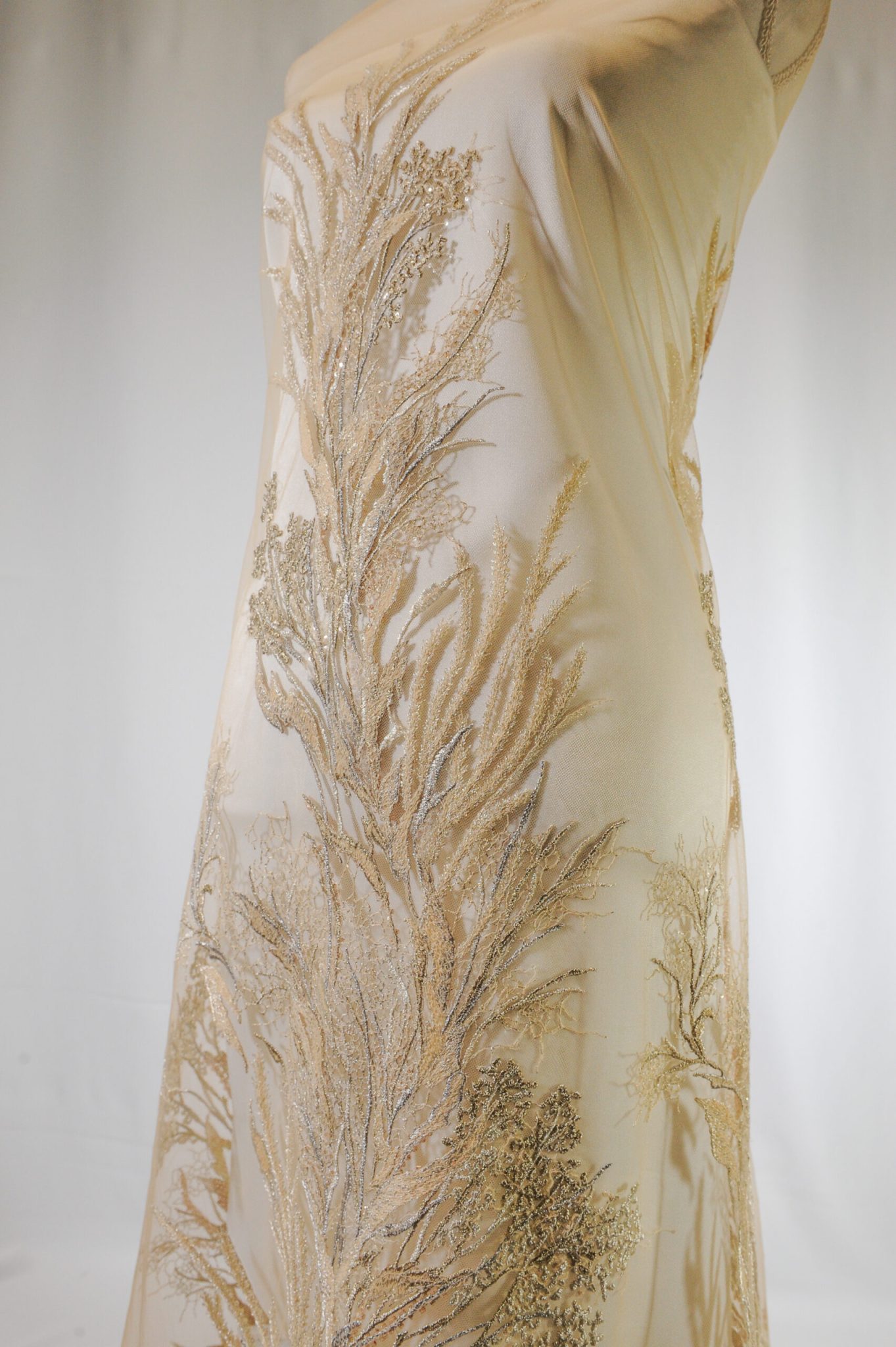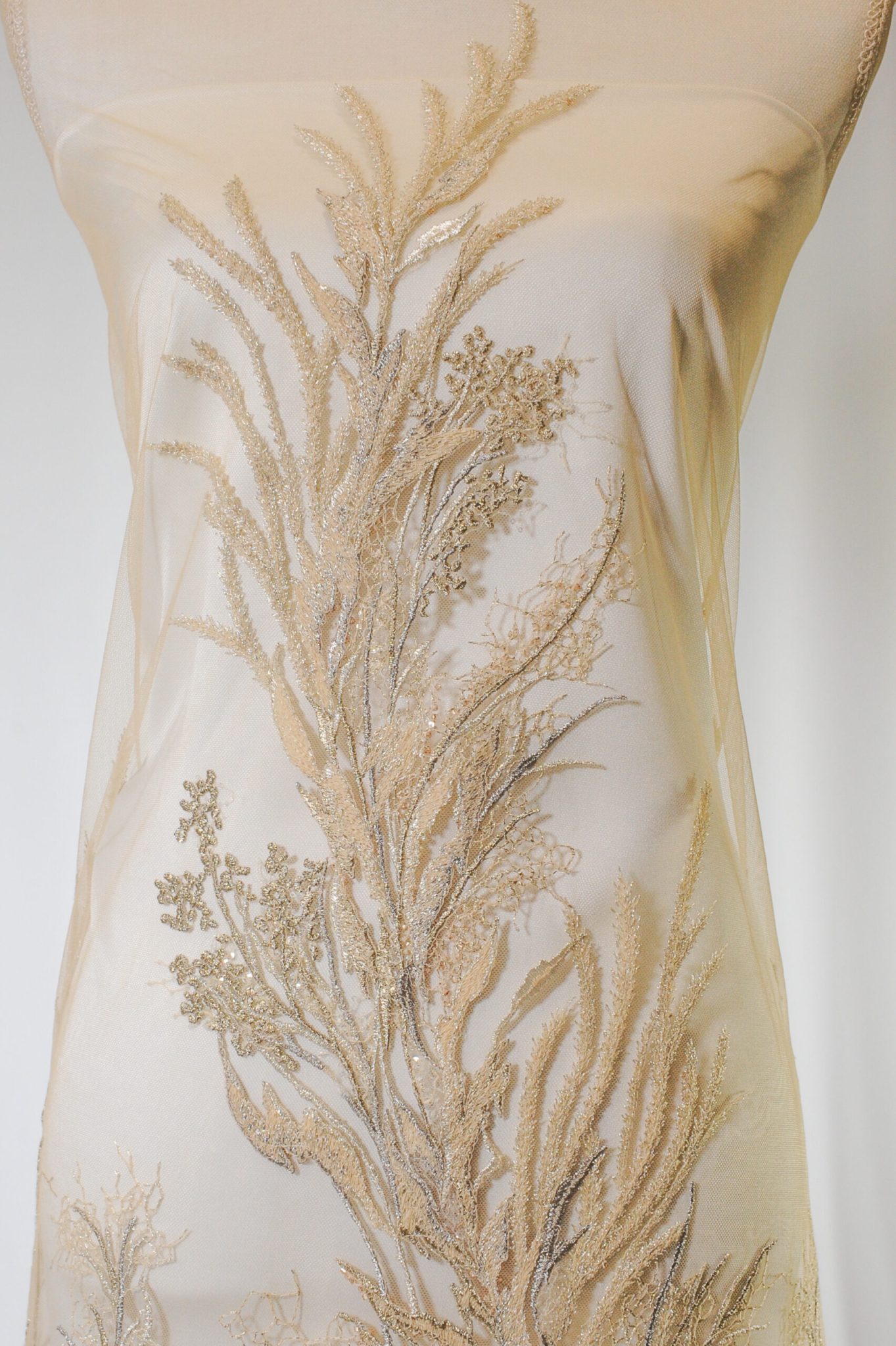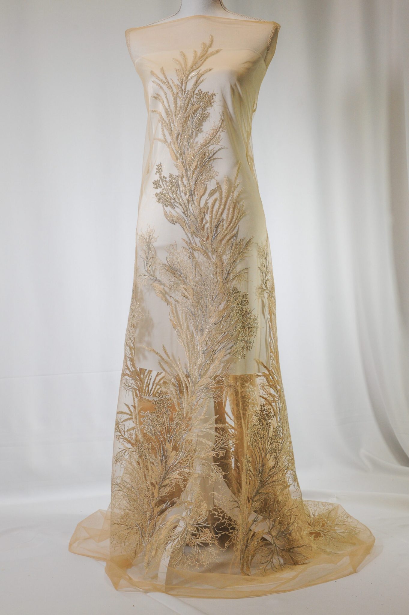 Broderia pe tulle este accesorizată cu paiete, mărgele și perle gri, aurii, de diferite dimenșiuni și forme, asezate sub forma unui copac, în partea de jos aglomerandu-se putîn broderia, ceea ce îi oferă dantelei un aspect spectaculos și luminos.