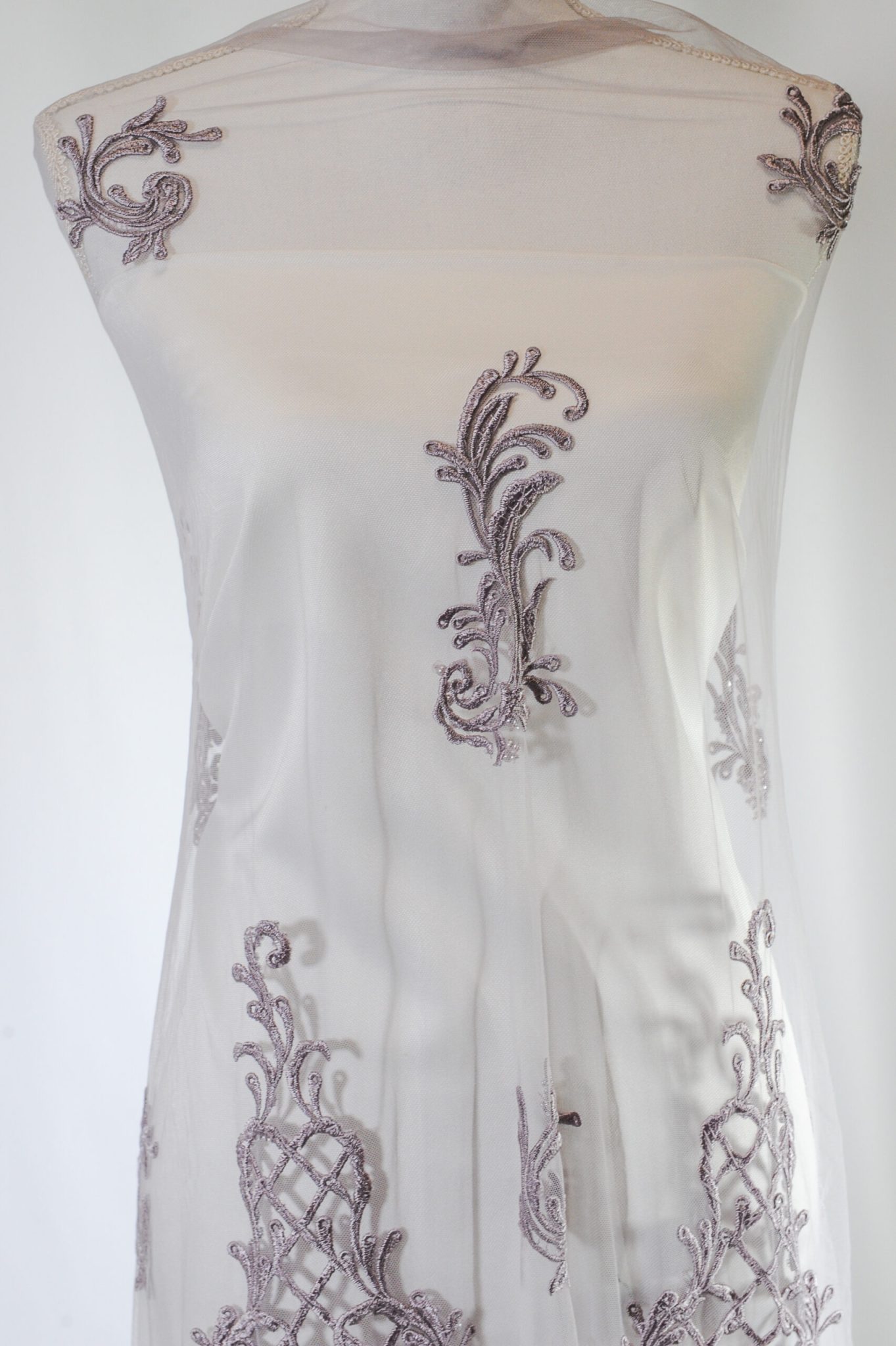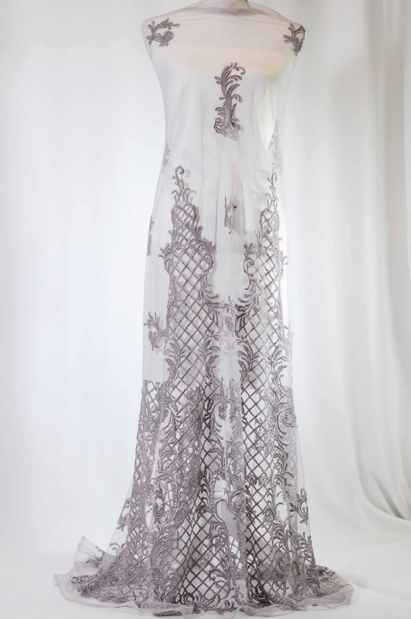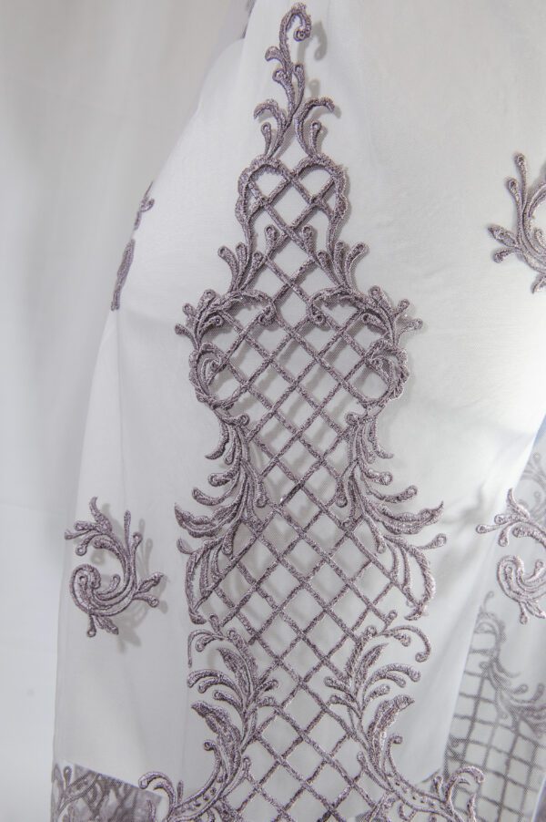 Broderia mov pe tulle este accesorizată cu paiete, mărgele și perle sub forma de model royal cu romburi mici, ceea ce îi oferă dantelei un aspect spectaculos și luminos.