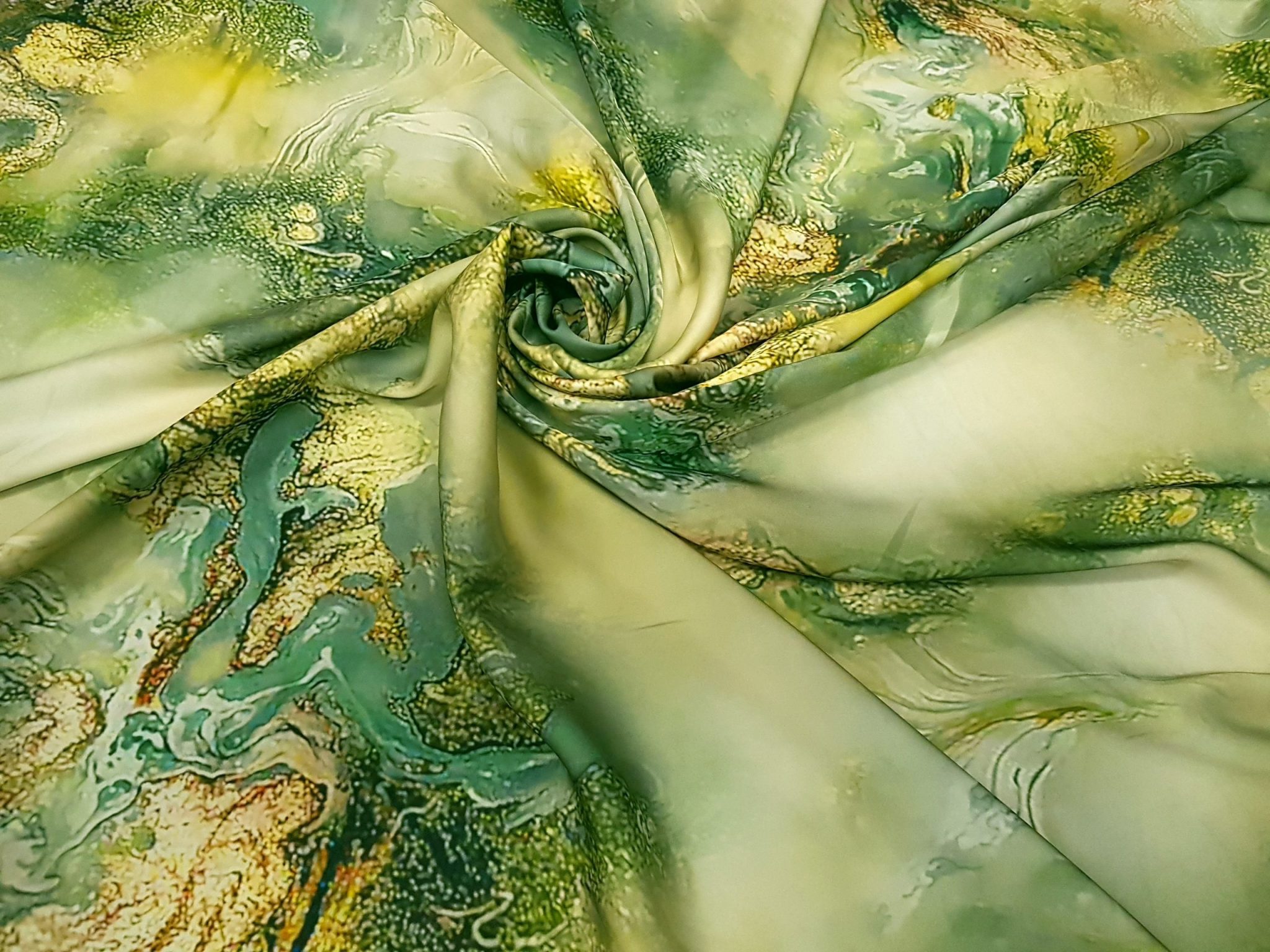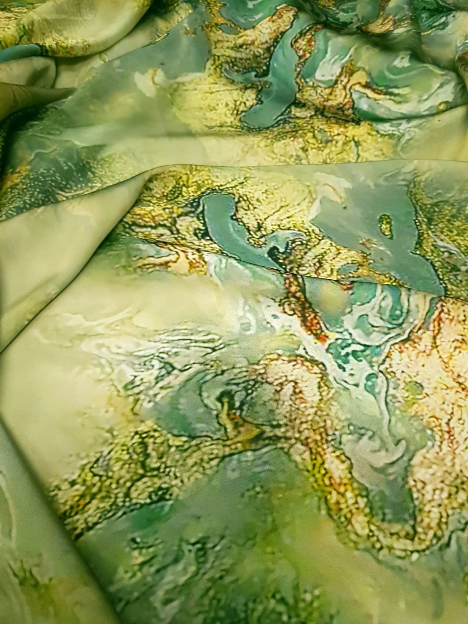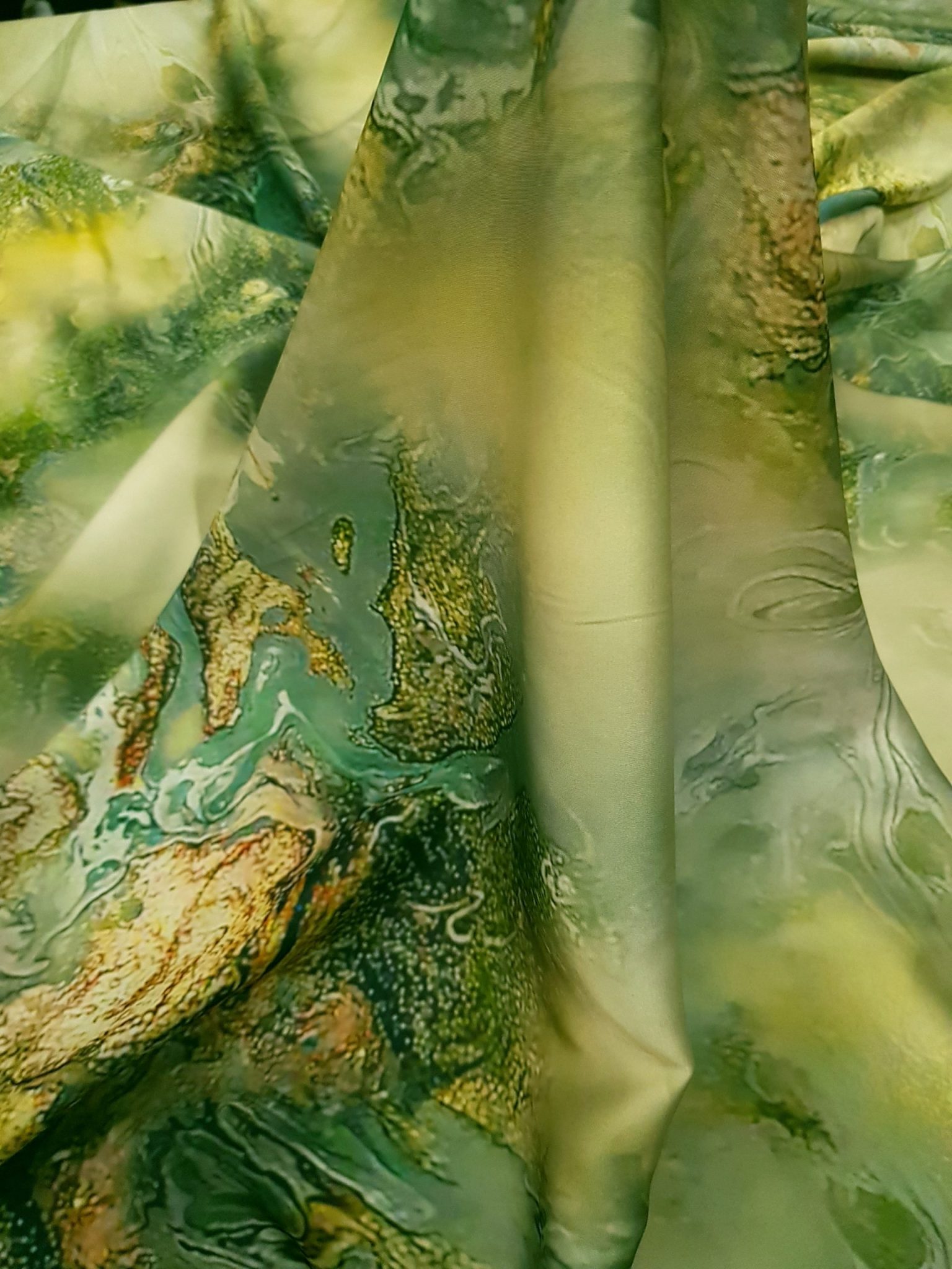 Aspect: Luciu natural, specific mătăsii, care pune în valoare imprimeurile artistice și culorile vii.