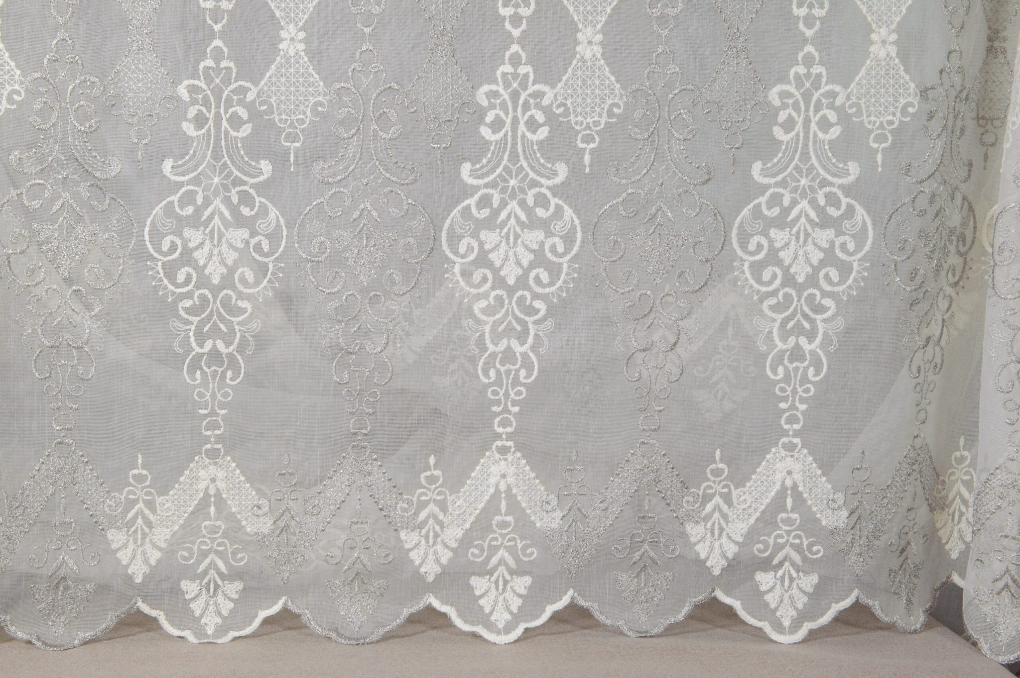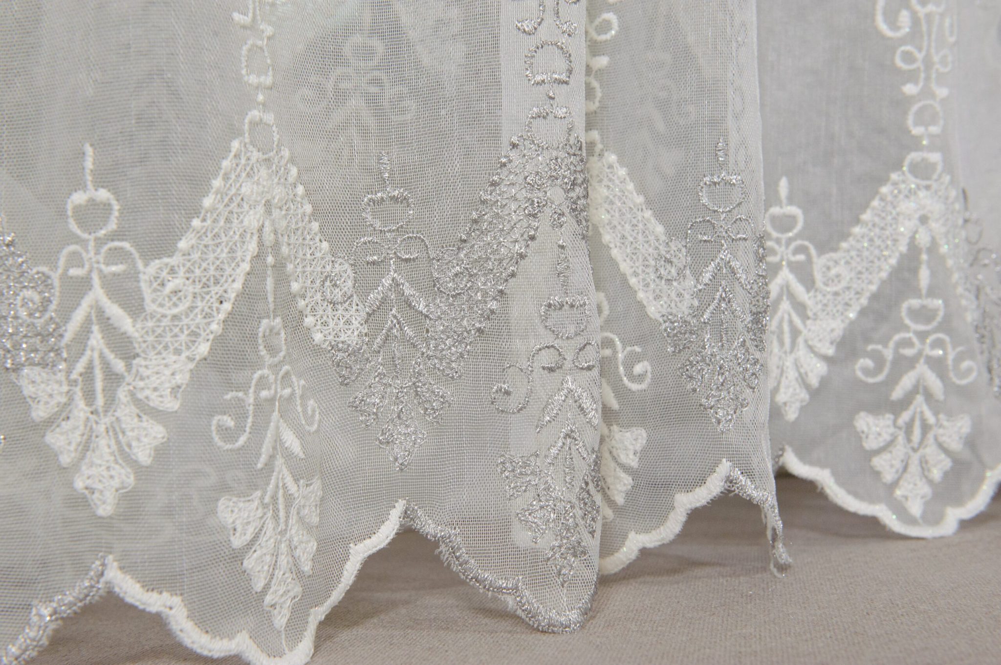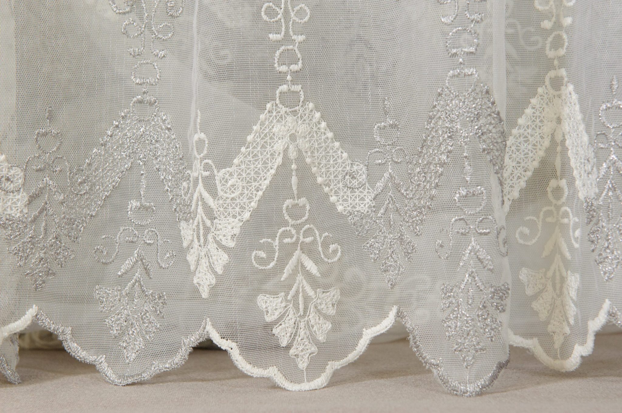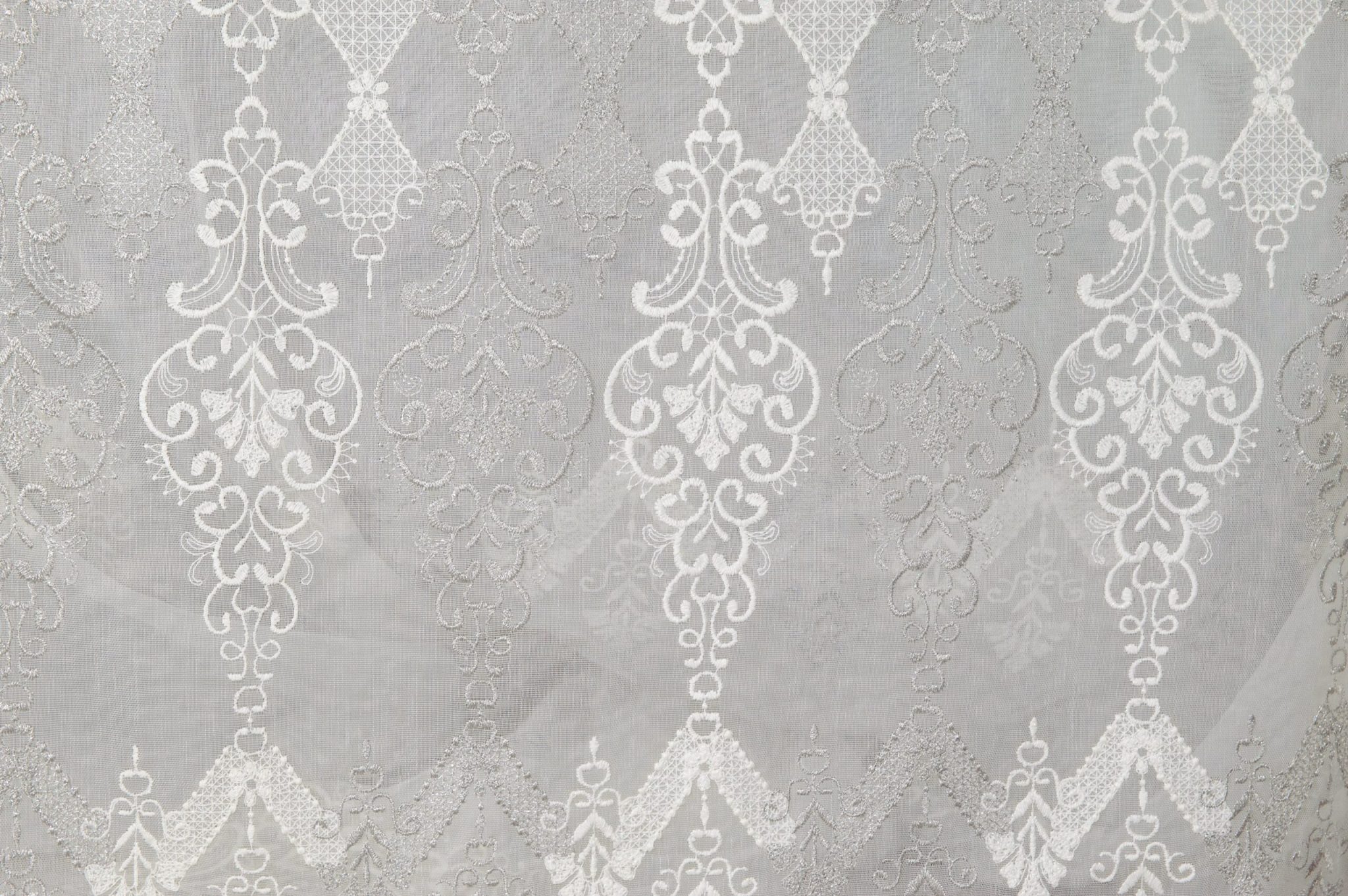 Țesătura este un tulle, ușor transparent cu o ținută delicată. Dispune de un imprimeu argintiu, ivory , care permite luminii să pătrundă, creând o atmosferă luminoasă.