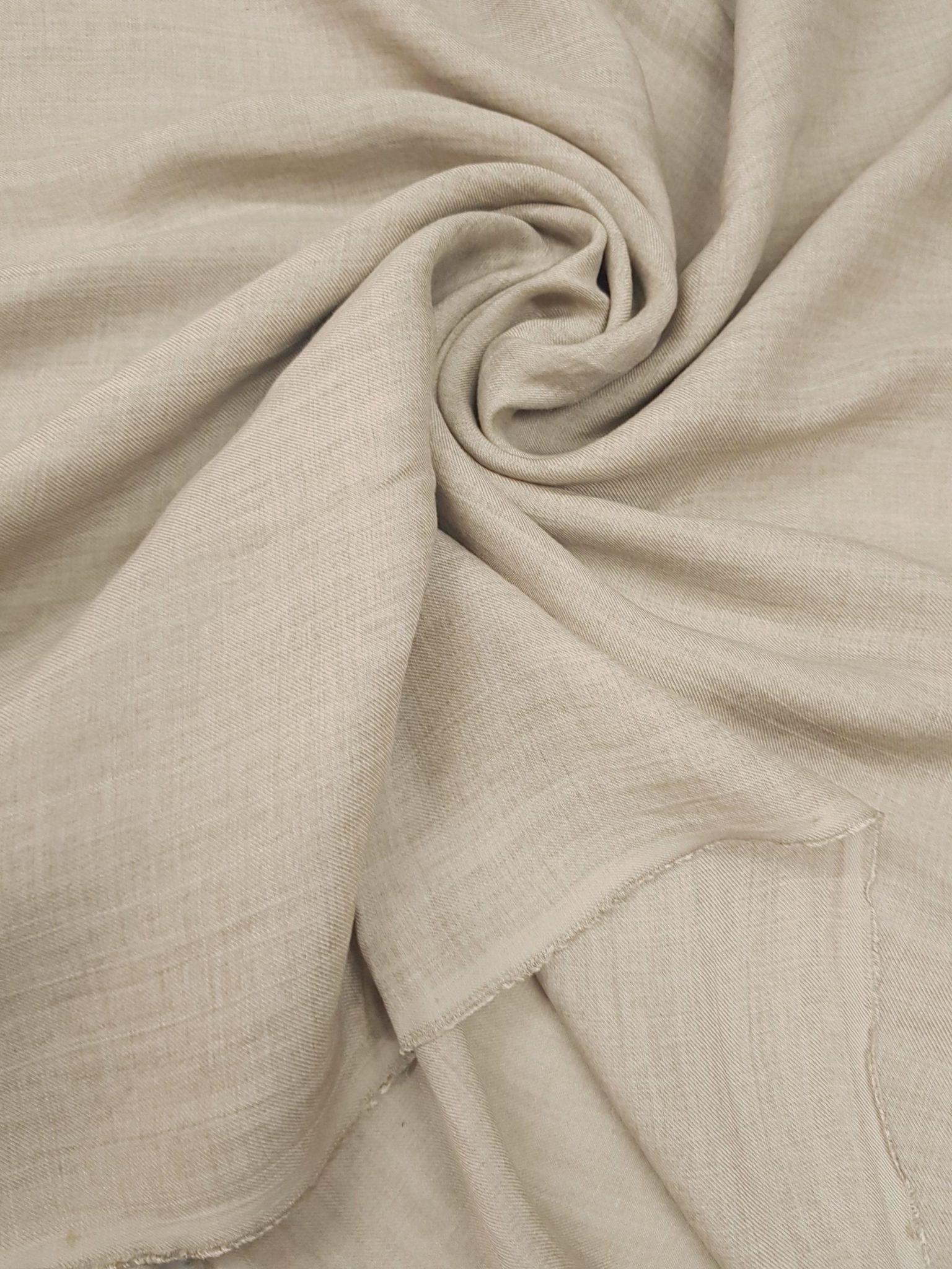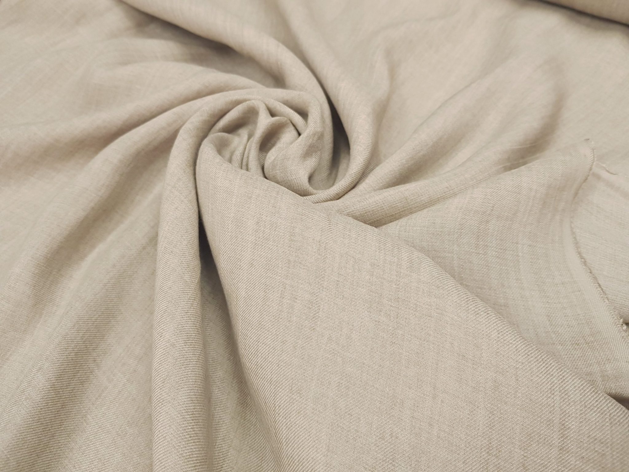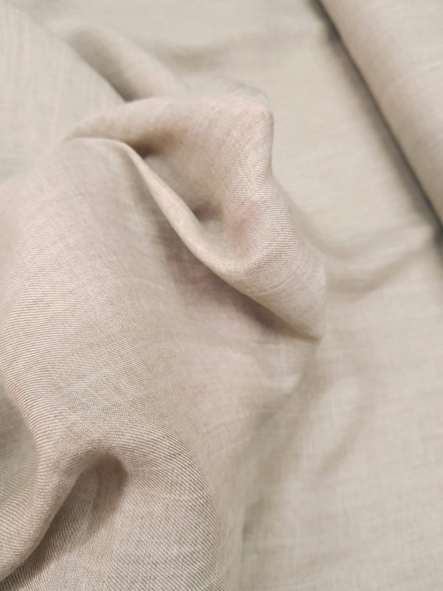 Această țesătură delicată emană rafinament prin textura sa ușor striată și mătăsoasă la atingere. Într-o nuanță caldă, naturală , materialul pare să curgă lin, asemenea unei brize blânde peste piele. Firele fine sunt împletite cu grijă, oferindu-i o suplețe vizibilă și o cădere fluidă. Ușoarele cute din imagini sugerează o moliciune autentică, iar țesătura pare ideală pentru creații vestimentare vaporoase, confortabile și elegante. Este genul de material care îmbrățișează corpul discret, fără să-l constrângă — moale, lejer, cu o prezență subtilă dar de efect.
